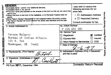 The foregoing SUBPOENA was mailed via U.S. Mail to the above named Vernon McCarty, Bureau of Indian Affairs, 101 N. 51, Muskogee, OK 74401, certified mail, return receipt requested, on the 5th day of Aug., 1997; service was had on said Vernon McCarty on the 6th day of August, 1997. Receipt for Certified Mail and Domestic Return Receipt are attached hereto and made a part hereof.