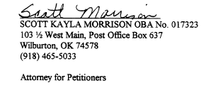 I, Scott Kayla Morrison , attorney for Petitioners Douglas Dry, Rosie Burlison and Juanita McConnell, hereby certify that on the 16th day of March, 1998, I sent a copy of the foregoing Docketing Statement to Robert L. Rabon, attorney for appellees, at Post Office Box 726, Hugo, Oklahoma 74743 by way of United States mail or courier.